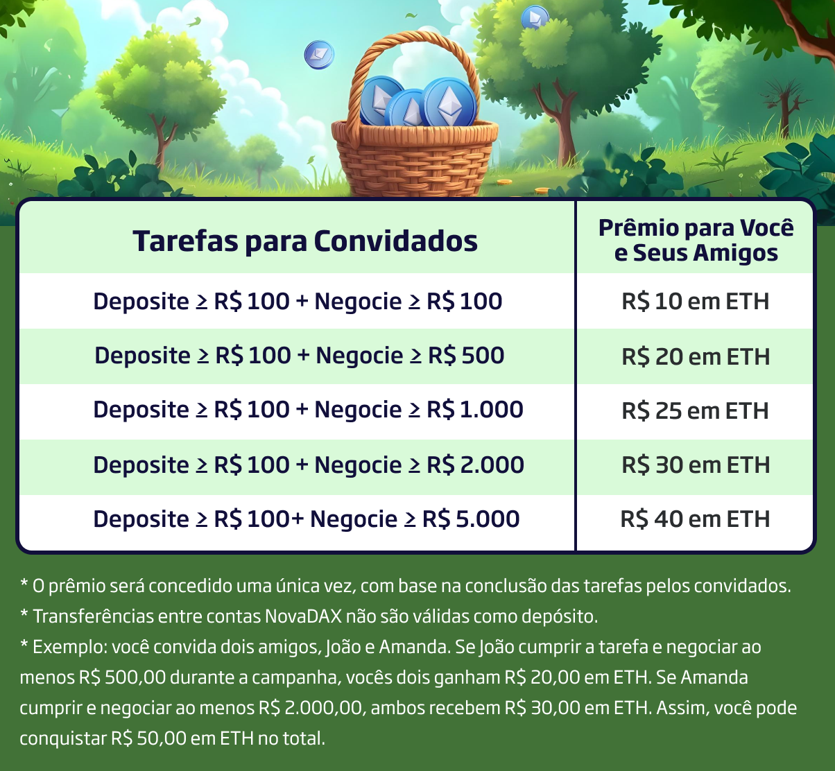 Use seu código exclusivo de convite e compartilhe com seus amigos. Indique para que se cadastrem, depositem no mínimo R$ 100,00 e negociem pelo menos R$ 100,00 na NovaDAX durante o período da campanha.
