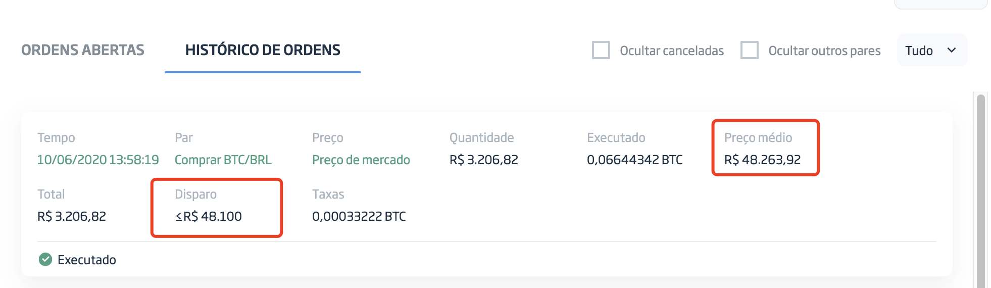 Como você pode ver no print abaixo, o preço de disparo foi alcançado e a ordem Stop-Market foi executada pelo melhor preço disponível no mercado naquele momento: R$ 48.263,92.