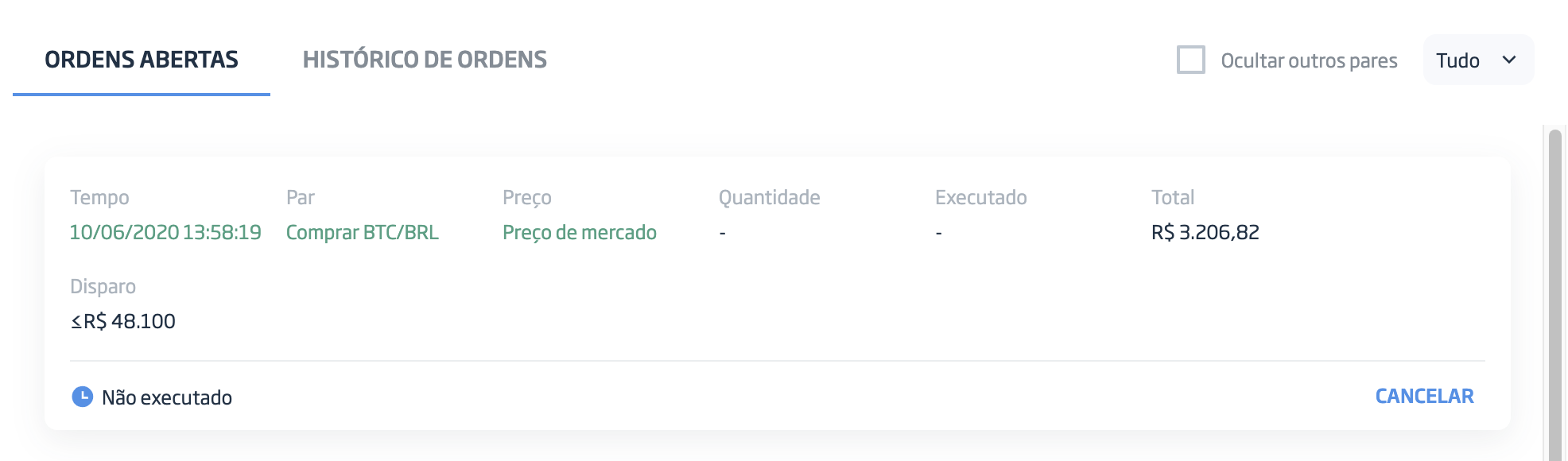 - O preço de execução pode ser diferente do preço de disparo. Isso é normal e acontece devido à volatilidade do mercado e à rapidez da execução.
