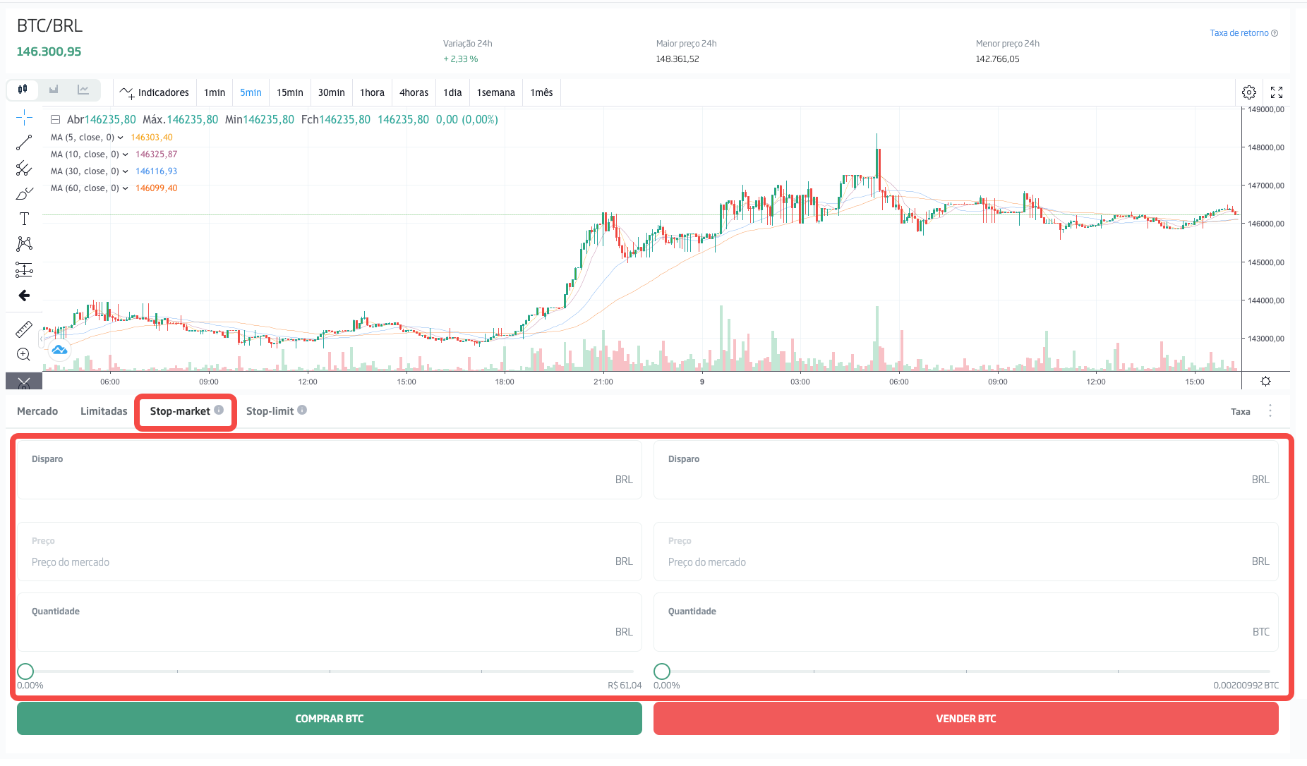 O preço do BTC em reais está R$ 48.286,50, mas você quer colocar uma ordem Stop-Market com disparo em R$ 48.100.