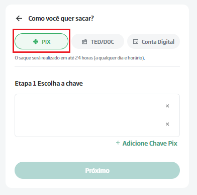 Você pode selecionar a chave PIX de sua preferência para realizar o saque.