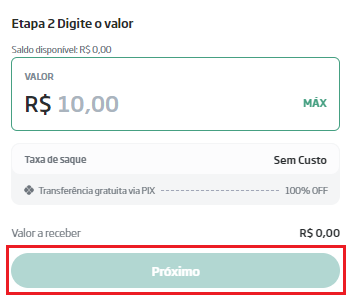 - O valor mínimo para saque é de R$10,00.