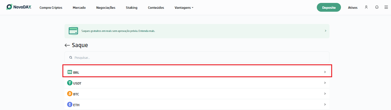 A conta de destino deve estar vinculada a uma conta bancária com a mesma titularidade da sua conta na NovaDAX.